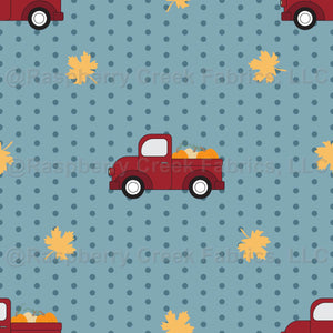 Autumn Harvest Red Truck Dots; Red truck with pumpkins, fall leaves on blue background with blue dots; gold leaves