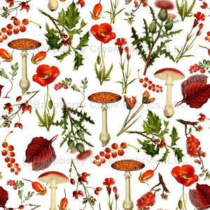 Antique hand painted mushroom pattern with different forest mushrooms, branches, blossoms, wild flowers, design by Uta Naumann UtART from Germany An exceptionally luxurious design with beautiful details - a solitaire for your home.