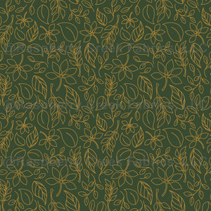 Hand-drawn leaf motifs in solid line outlines, scattered on a solid background, in dark green and gold.