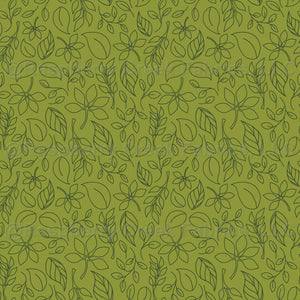 Hand-drawn leaf motifs in solid line outlines, scattered on a solid background, in beautiful shades of green.