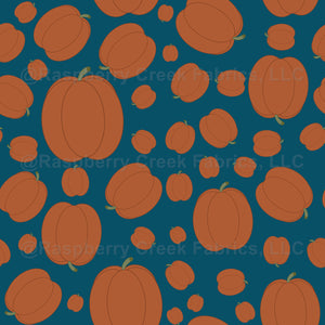 Traditional orange pumpkins on a deep teal background. Perfect for autumn decor or your new favorite fall outfit.