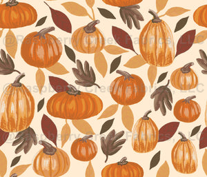 Autumn Pumpkins hand painted in gouache on a beige color background with lots of fall leaves in red, yellow, and green.