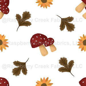 A cute autumn design with mushrooms, crisp brown autumn leaves and sunny little sunflowers. Perfect for a Autumn woodland aesthetic