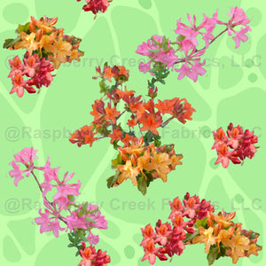 Pink, coral, orange, and yellow azaleas create a gorgeous floral design for spring on this butterfly green chintz fabric.