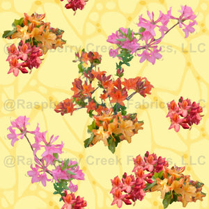 Pink, coral, orange, and yellow azaleas create a gorgeous floral design for spring on this lemon drop yellow chintz fabric.