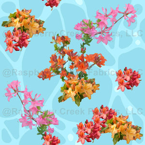 Pink, coral, orange, and yellow azaleas create a gorgeous floral design for spring on this aqua chintz fabric.