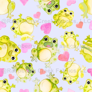 Children Collection: Baby frogs with green spots swimming in a blue pond surrounded by watercolor hearts in pink, lavender and coral hues.