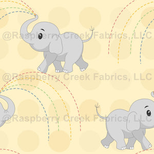 Adorable baby elephants spray a rainbow of joy on a pale yellow background. Just the thing for nursery and baby projects.
