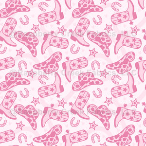 """Baby Pink Cowgirl Boots and Hats"" is a sweet and stylish seamless pattern featuring adorable illustrations of cowgirl boots and hats in soft baby pink hues. "