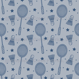 A pattern design featuring line art doodles of badminton rackets and shuttlecocks on a gray background. Perfect for sports-themed activities and decor.