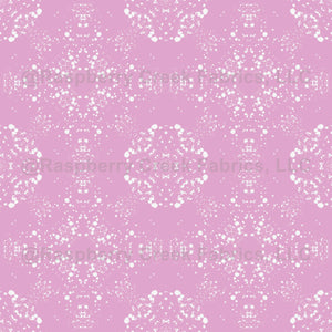 A repeating pattern of circular white motifs with intricate details on a pink background creates a symmetric and decorative design.