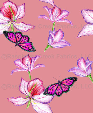 Bauhinia Blossom red rose color flowers with butterlies on the plain color background