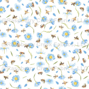 Charming, playful bumble bees buzzing among vibrant blue flowers, evoking a lively and cheerful springtime vibe. Perfect for adding a touch of nature!