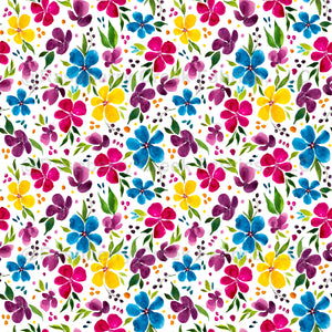 Jewel tone boho watercolor full floral. Ruby red, sapphire blue, citrine yellow, and amethyst violet flowers with green leaves on white. Large Scale, home decor, fabric