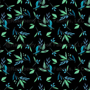 Scattered teal Blue and Green Botanical Leaves on Black. Garden, nature, calm. Coordinate for the Bianna Watercolor floral Collection. Medium Scale, nature, plants, fabric, home decor, Winter, Summer