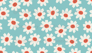 Oversized, playful flowers dance on a light seafoam background.