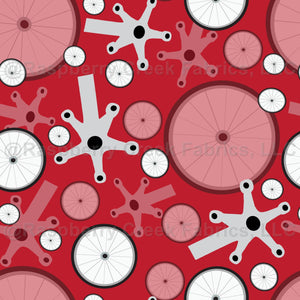 Bike Boss Collection. Multi-directional bike parts on a red background.