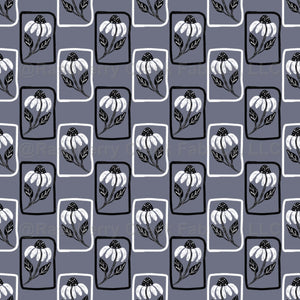 Digital Block Print style floral featuring black & white coneflower with alternating BW rectangles gray background. Country, modern, artistic. Fabric, Home Decor