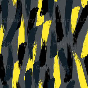 Black, dark teal and yellow brush strokes, against a grey background.