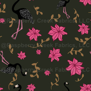 A tropical repeating pattern of black flamingos on a dark green background with pretty pink flowers and gold motifs!