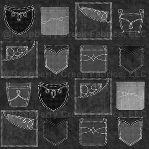 Inspired by the fancy stitches on jean pockets, this design in black with gray and white details features different styles of pockets arranged in a grid, with twenty pockets to a square that can be sized from 6 inches up to 24 inches on a side.