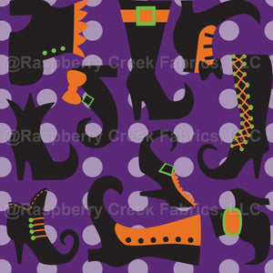 Black Orange Green Witch Boots and Shoes Dark Purple and Lilac Polka Dots Tossed Print