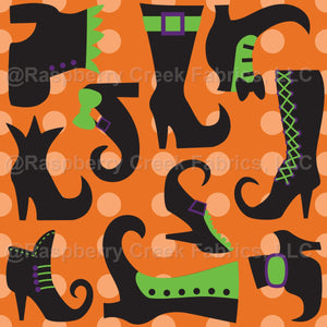 Black Orange Purple Witch Boots and Shoes Orange and Peach Polka Dots Tossed Print