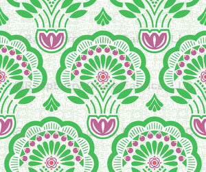 Blooming flamboyant flowery. Bright green, purple, coral on white and celadon (light blue green) for the texture.