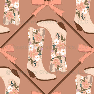 Pretty cowgirl boots with wildflowers and girly bows with rope accents. Perfect for quilts, kids clothing, home decor and hair accessories.