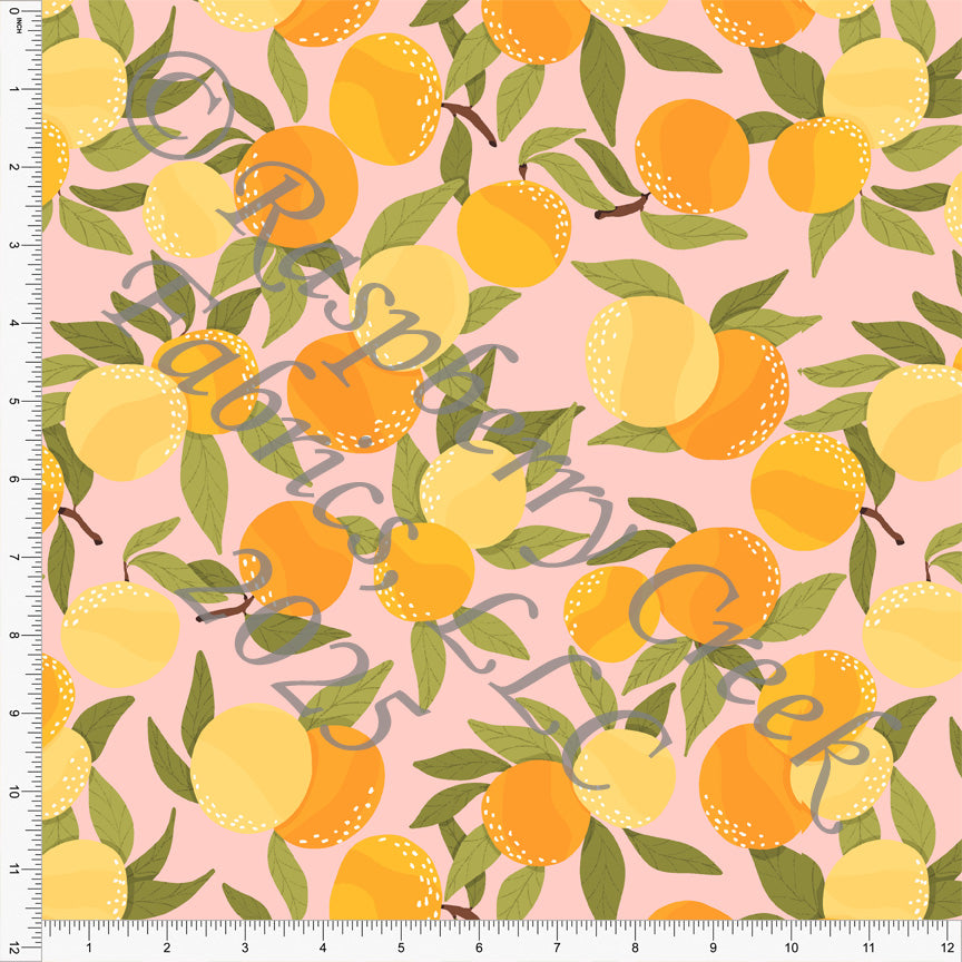 Blossom Pink Orange Yellow and Olive Green Oranges Print Fabric, 2025 Fruits by Brittney Laidlaw for CLUB Fabrics