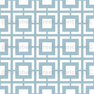 This fabulous mid century inspired fabric features a white square breeze block pattern on a light blue background.