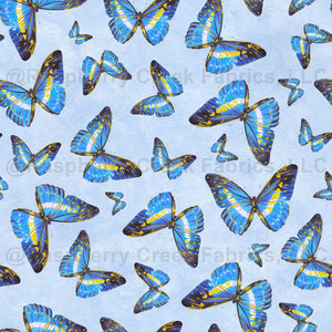 Delicate blue butterflies gracefully flutter across a serene sky-blue backdrop, creating a tranquil, ethereal pattern that evokes peace and harmony.