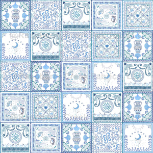A tile pattern inspired by the Greek islands and the luscious blue of the ocean. Perfect for nautical and whimsical themes.