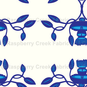 Blue silhouette scroll vine flowers on a pale yellow background.