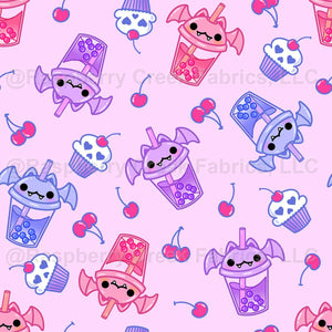 Boba bat pattern has a bubble tea bat with cherries and skull cupcakes in pink, periwinkle blue and purple.