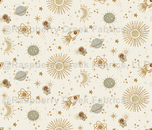 Little adventurers light up space with their star wands, illuminating the sun, moon, stars, and planets. Ivory, sage, sepia, gold, and grey