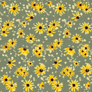 Scattered black-eyed Susans and creamy little coreopsis flowers create a delightful boho design on wild sage.