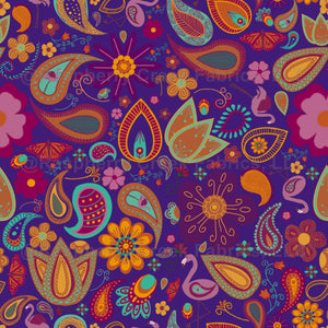 Hand drawn flamingos and butterflies hiding in a garden of stylized flowers and paisley elements in this whimsical multicolored design on a field of rich amethyst. Shades of citrine, garnet, turquoise, and more lend jewel toned splendor.