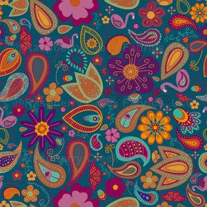 Hand drawn flamingos and butterflies hiding in a garden of stylized flowers and paisley elements in this fun multicolored design on a deep sea teal background. Shades of citrine, garnet, turquoise and more lend jewel-toned splendor.