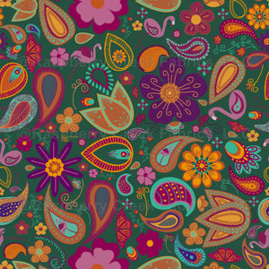 Hand drawn flamingos and butterflies hiding in a garden of stylized flowers and paisley elements in this whimsical multicolored design on a field of emerald green. Shades of citrine, garnet, turquoise and more lend jewel-toned splendor.
