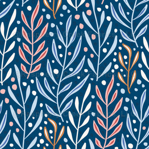 Boho pattern with colorful leaves on a dark blue background.