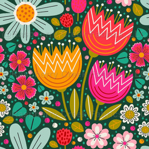 colorful blooming spring tulip, pansy, forget me not and other wild flowers graphic bold modern style