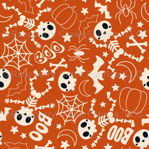 Boo! Halloween Skeletons Pumpkins Spiders Bats Skulls in Orange