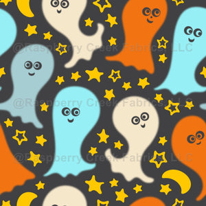These kawaii cute and spooky Halloween ghosts are hanging out in the night sky amongst stars and moon! Trick or treat! In pastel colours of pink, blue, green, purple, turquoise and gray on dark blue! This design is also available in Traditional Colours too (ie. White, Blue, Orange and Yellow on Dark Brown!