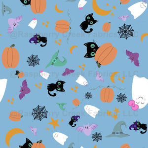 Smiling ghosties and cute black kittens play among pumpkins with little bat friends. A fun Halloween theme with fun colors, perfect for kids (or anyone looking for a cutesy holiday design).