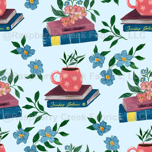 Books and Pink Coffee Mug with Pink Flowers and Botanicals perfect for soft feminine girly decor, teacher, book lover, book store, library in light blue