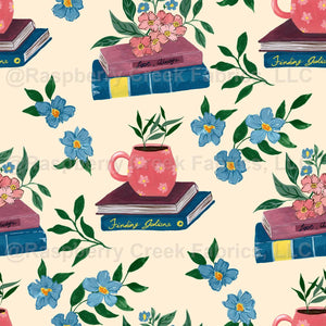Books and Pink Coffee Mug with Pink Flowers and Botanicals perfect for soft feminine girly decor, teacher, book lover, book store, library in neutral beige