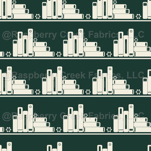 Ideal for those who love books, contemporary decor, and dark forest emerald green! Perfect for cheater quilts, home decor, or literary projects.