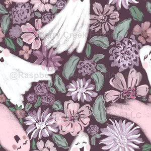 Booquet, floral, pastel, pastel halloween, bouquet, Halloween, fall, girls, spooky cute, women, whimsical, pink, white, lilac, dark purple, purple, kids, hand drawn, gouache, ghosts