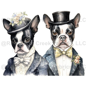 Boston Terrier Dog Old West couple Top Hat 16 inch panel. Dogs in top hat, and old fashioned suits.